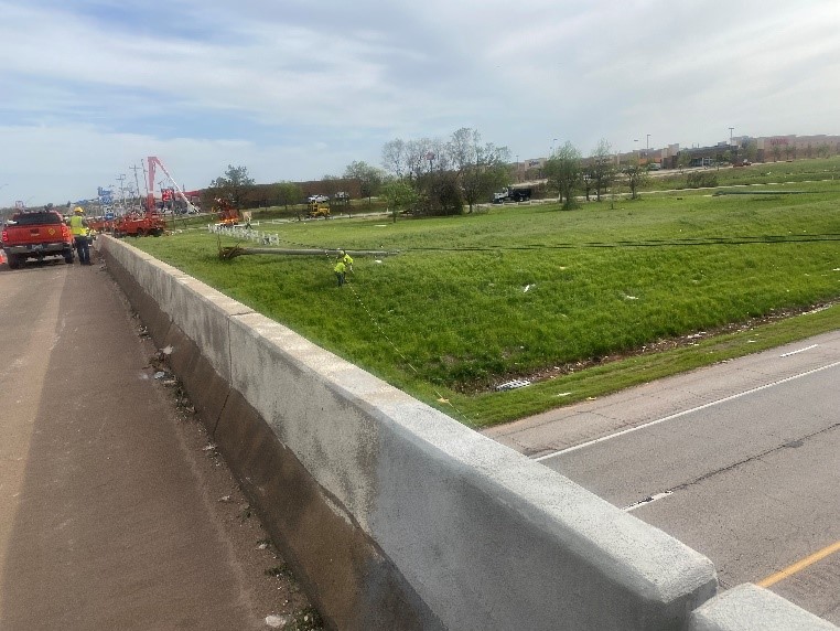 OG&E crews repair damaged poles and power lines over I-40 in Shawnee on Thursday afternoon following damaging winds and confirmed tornadoes that moved through the service area Wednesday night.