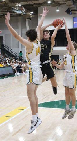 North Rock Creek graduate Jordan Coody gets a shot off for Randall University in the lane against Oklahoma Baptist in Shawnee Tuesday night. The Bison topped the Saints 107-60. Photo Credit: Kent Bush