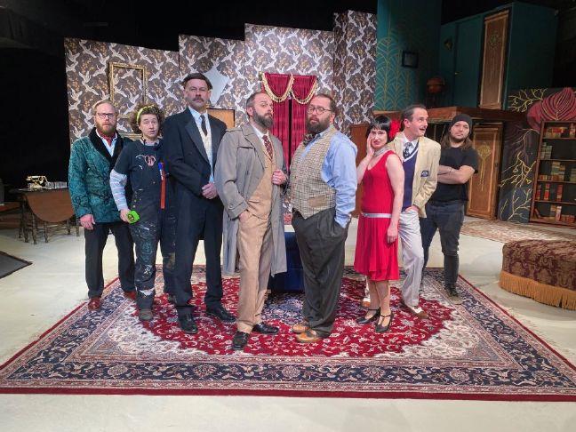 The frazzled cast of SLT's comedy farce, "The Play That Goes Wrong" includes Tom Dahlman, Elizabeth Sidler, George Wright, Jeff Foresee, Eric Strimple, Jill Fry, Carson Misner and Tanner Rippee. Photo Credit: SLT
