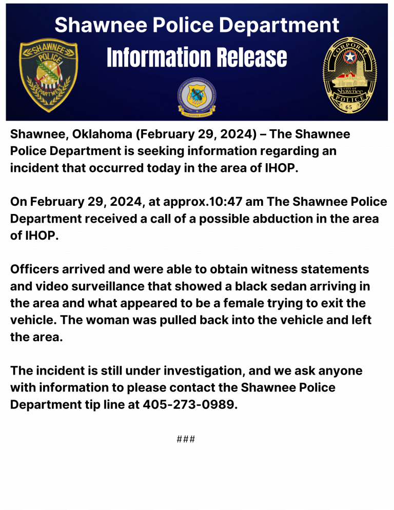 Home News UPDATED: Shawnee police investigate alleged kidnapping near iHOP UPDATED: Shawnee police investigate alleged kidnapping near iHOPFebruary 29, 2024News UPDATE Shawnee, Oklahoma (March 4, 2024) – After further investigation, the reported abduction incident from last Thursday was a domestic. Detectives made contact with the… Login to continue reading Login Sign up for complimentary access Sign Up Now Close Previous Post Premiere park, KidSpace, experiences another temporary shutdown Next Post Editorial cartoons Featured Local Savings -