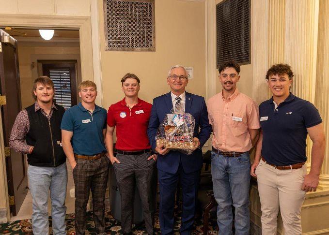 Members of the SSC Presidents Leadership Class and the Trojan baseball team present Oklahoma State Senator Darcy Jech with an SSC goodie basket at the Capitol. Sen. Jech is a member of the SSC Alumni Hall of Fame and played baseball for the Trojans during his time at the college. Pictured (left to right): Cooper Hamilton of Tahlequah, Daylan Saxon of Seminole, Logan Hill of Edmond, Sen. Jech, Royce Florenzano of McAlester and Cole Girard of Oklahoma City. Photo Credit: SSC