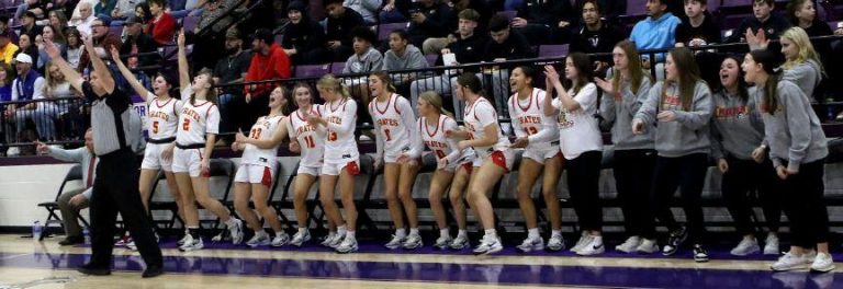 The Dale bench celebrates a 3-pointer by Gracee Radford in the second half of the Lady Pirates' win over Calera in the Area Tournament finals Friday in Chickasha.Photo by Kent Bush