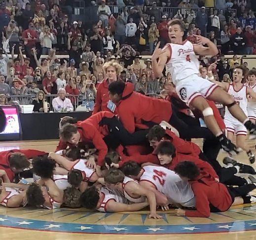 Dale's Jett Higdon (4) poses as he dives atop the Pirates' dogpile after they beat Pocola 63-38 in the championship game Saturday night in the Jim Norick State Fair Arena. Photo Credit: Kent Bush