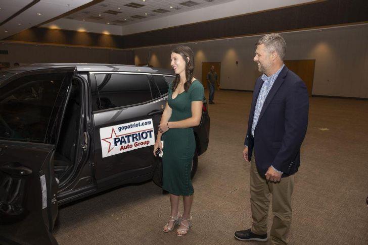 Asher graduate Alexis Johnston was named the 2024 Patriot Auto Group Student of the Year at the 2023 Best of Tri-County Area Preps gala Tuesday night at the Expo Center. With the award, Johnston won a new Jeep Compass. At right is Tatton Manning from Patriot Auto Group. Photo Credit: Garett Fisbeck