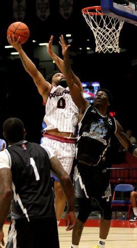 The Potawatomi Fires Deshawn Munson (0) puts up a hook shot against Wichita Saturday night at FireLake Arena.Photo by Kent Bush