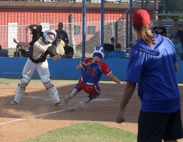Chandler's Rylee Capps slides away from a tag to get one of the two runs scored for the Lady Lions. Capps had two hits, two RBI and two runs scoredPhoto by Kent Bush.
