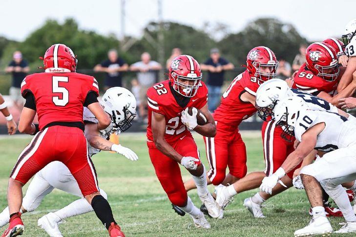 North Rock Creeks Caleb Hawkins (22) carries the football against Marlow last Friday night at NRC.Photo courtesy of Sheryl Gowin/Gowin Photography