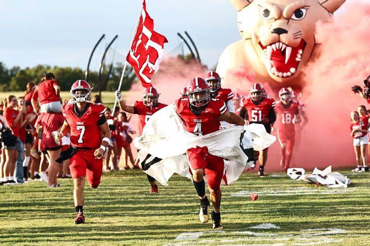 North Rock Creeks J.J. McClain Jr. (4) and Landon Kelough (7) lead the team out on the field prior to the Cougars 17-7 home win over Marlow on Aug. 30.Photo courtesy of Sheryl Gowin/Gowin Photography