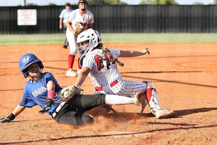 North Rock Creek catcher Ashlyn Bade (64) makes the tag on the Dibble runner at home Thursday.Photo courtesy of Sheryl Gowin/Gowin Photography