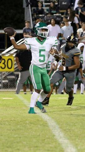 Seminole quarterback Dontre Garfield fires a pass Friday night. Garfield threw for two touchdowns and ran for three 2-point conversions in the Chieftains' 24-8 win over Tecumseh. Photo Credit: Kent Bush