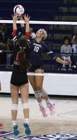 Shawnee senior Harlee Bullard gets one of her four kills Tuesday night in the Lady Wolves' straight set win over North Rock Creek. Photo Credit: Kent Bush
