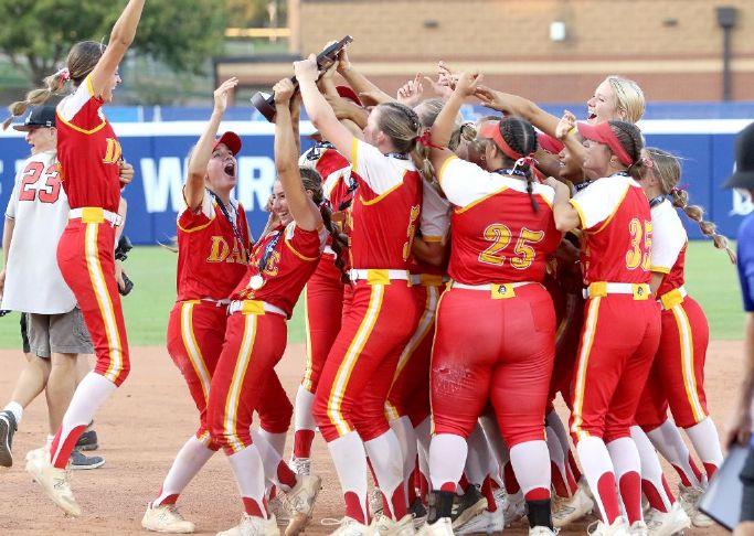 The Dale Lady Pirates celebrate after a run in the bottom of the seventh gave them a 1-0 victory over previously undefeated Pocola to claim their second straight 2A State Championship. See related story and photos on B1. Photo Credit: Kent Bush