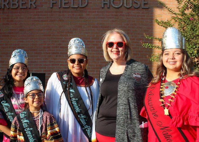 Tribal princesses greeted guests and posed for photos at the event. Pictured (left to right): Little Miss Seminole Nation Emma Wise, Junior Miss Seminole Nation Analees Martinez, Miss Seminole Nation Adyson Beaver, SSC Vice President for Finance, Grants and Enrollment Melanie Rinehart and Delaware Nation Princess Kayleigh Combs. Photo Credit: SSC