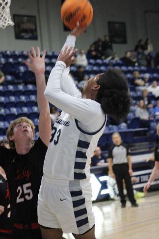 Shawnees Aidon Siqueiros (33) puts up a shot against Tulsa Bishop Kelley Friday.Photo by Brian Johnson