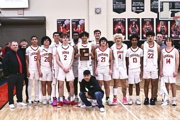 The North Rock Creek boys basketball team poses with their district championship trophy last Saturday after defeating Seminole 68-33. The Cougars (20-2) host Holland Hall Thursday at 7:30 p.m. in the first round of a Class 4A regional.Photo courtesy of Sheryl Gowin/Gowin Photography