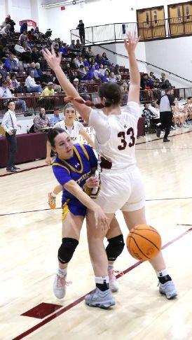 Bethel point guard Ava Gascon wraps a pass around an Atoka defender. Gascon led the Lady Wildcats with 19 points in the 70-55 win over the Wampus Cats.Photo by Kent Bush