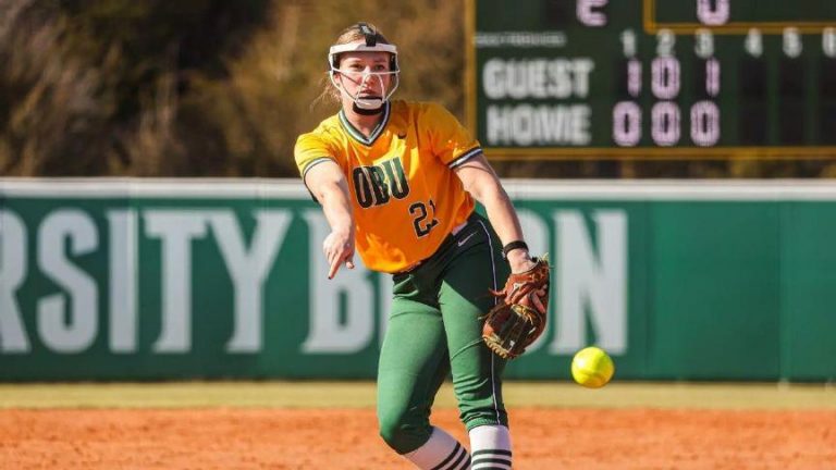 Oklahoma Baptists Jaycee Shaffer (21) delivers a pitch against Henderson State.Photo courtesy of Oklahoma Baptist Athletics
