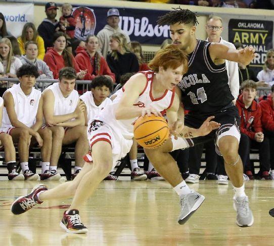 Dale Coach Jeff Edmonson looks on as his son, point guard Easton Edmonson drives to the basket against Pocola. The Pirates won their fourth straight 2A State Championship Saturday with a 60-20 win over the Indians. Photo Credit: Kent Bush
