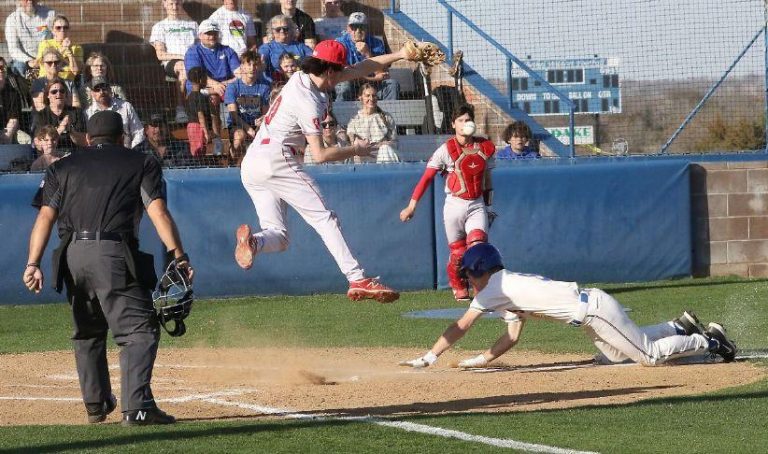 Prague's Henry Hankins leaps for a throw as Kadenn May slides in safely under the throw for one of Bethel's five runs in a 10-5 loss to the Red Devils.Photo by Kent Bush