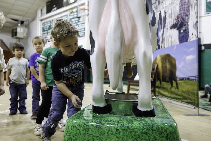 Milking Belle the cow is one of the students favorite stations in Oklahoma State University Extensions Farm to You interactive display. Farm to You helps children learn about where food comes from and how it nourishes the body to grow healthy muscles and bones. (Photo by Mitchell Alcala, OSU Agriculture) Photo Credit: Mitchell Alcala