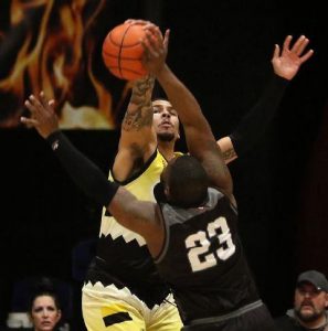 The Potawatomi Fires Jachai Simmons (left) applies defensive pressure against the Little Rock Lightning Friday night at Firelake Arena.Photo by Kent Bush