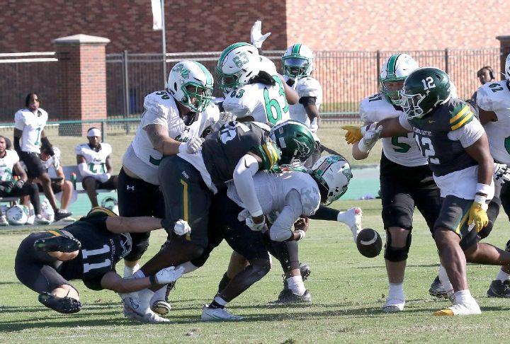 OBU defenders Brady Luff (11), Richard Smith (95) and Jahden Brown (12) combine for a sack and force a fumble that gave the Bison the ball back late in their 17-14 win over the University of Arkansas-Monticello Saturday. Photo Credit: Kent Bush