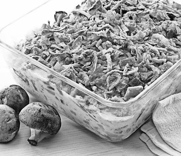 Serves: 8-12 Ingredients: 1 (12-ounce) package Bar-S Bacon, cooked and crumbled 1 package sliced J-M Farms Mushrooms 1 yellow onion, finely diced 2 tablespoons Hiland Dairy Butter 2 tablespoons Shawnee Mills All Purpose Flour 2 1/2 cups Hiland Dairy Half and Half or Whole Milk ¼ teaspoon nutmeg ½ teaspoon ground black pepper Salt to taste 2 large (28-ounce) cans Italian-style green beans 1 package french-fried onions Directions: 1. In a large cast-iron skillet, saute the bacon until crispy.