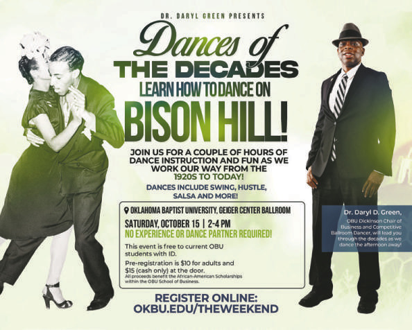 On Saturday, October 15, from 2-4 pm in the Geiger Center Ballroom, Oklahoma Baptist University (OBU) will showcase Dances of the Decades during Homecoming weekend (THE WEEKEND). This event is free to current OBU students with ID.