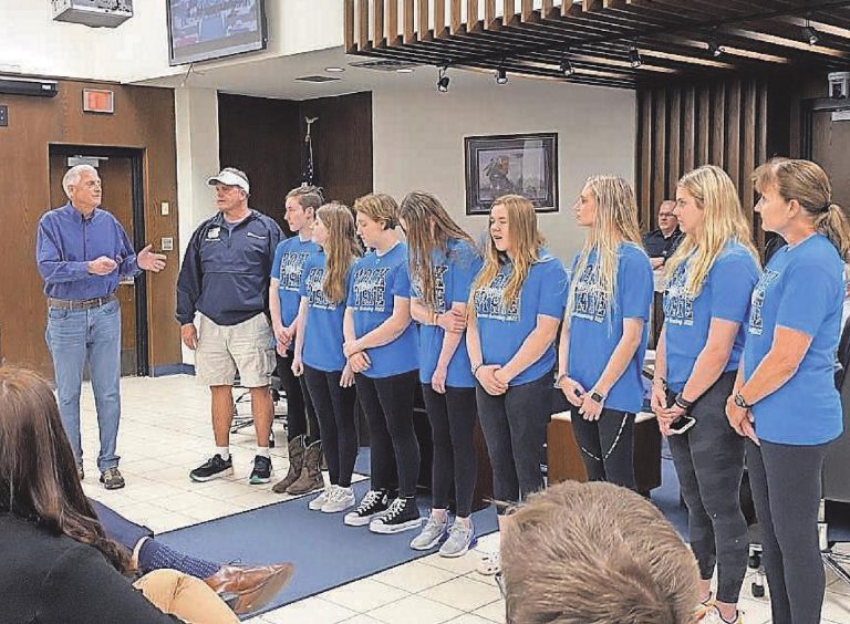 Shawnee Mayor Ed Bolt, at left, and the Shawnee High School girls swim team. On Monday, during the Shawnee City Commission meeting, Shawnee Mayor Ed Bolt publicly honored and recognized Shawnee High School’s girls swim team for their recent State Championship win. VICKY O. MISA SNS STAFF PHOTO